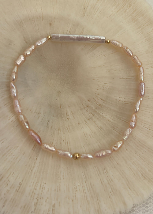 - Iridescent freshwater rice pearls in soft pink + creamy hues