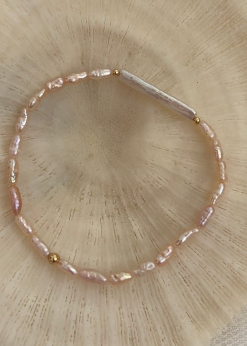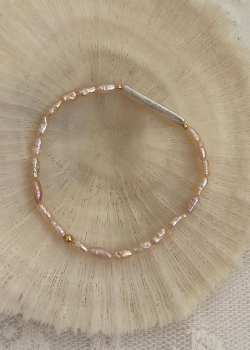 This stretchy beauty features candy-colored rice pearls and a dreamy silver toothpick pearl— Finished with tiny gold filled beads for just a hint of shimmer, it’s your everyday bracelet with mermaid vibes.