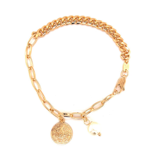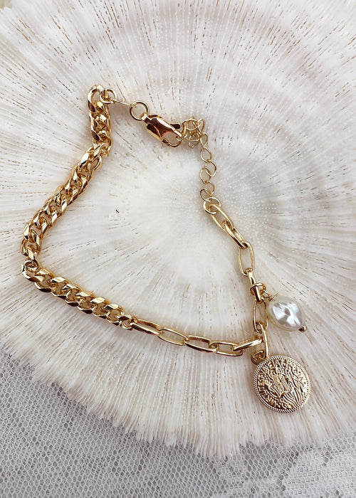 Luma Bracelet pairs a golden chain with a delicate coin and luminous pearl, creating a layered, sun-kissed look that’s perfect for stacking or wearing solo.