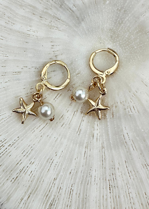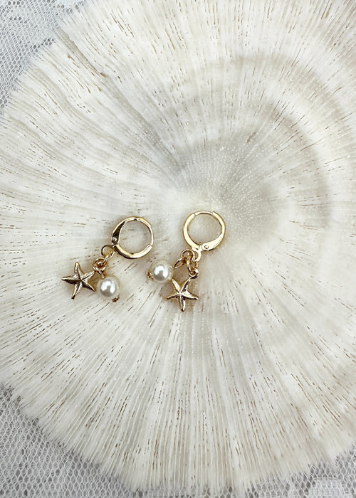 Embrace coastal charm with these dainty gold-filled hoop earrings, featuring a delicate starfish charm and a luminous pearl drop. Perfect for adding a touch of seaside elegance to any outfit, these lightweight earrings radiate timeless beauty and ocean-inspired allure. Ideal for beach days or breezy evenings.